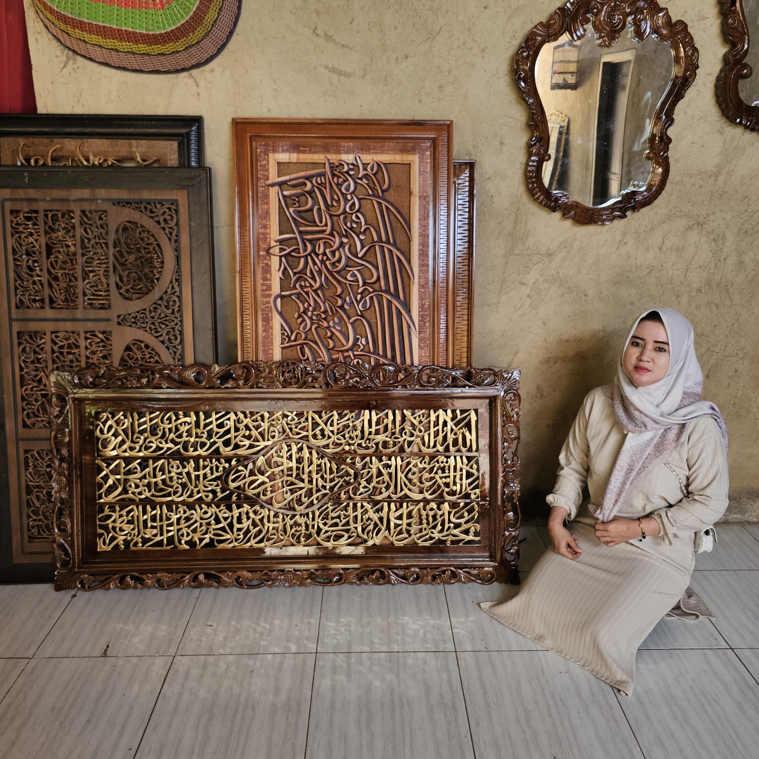 Karya seni islami yang memadukan keindahan ukiran Jepara dengan makna suci Surat Al-Fatihah.