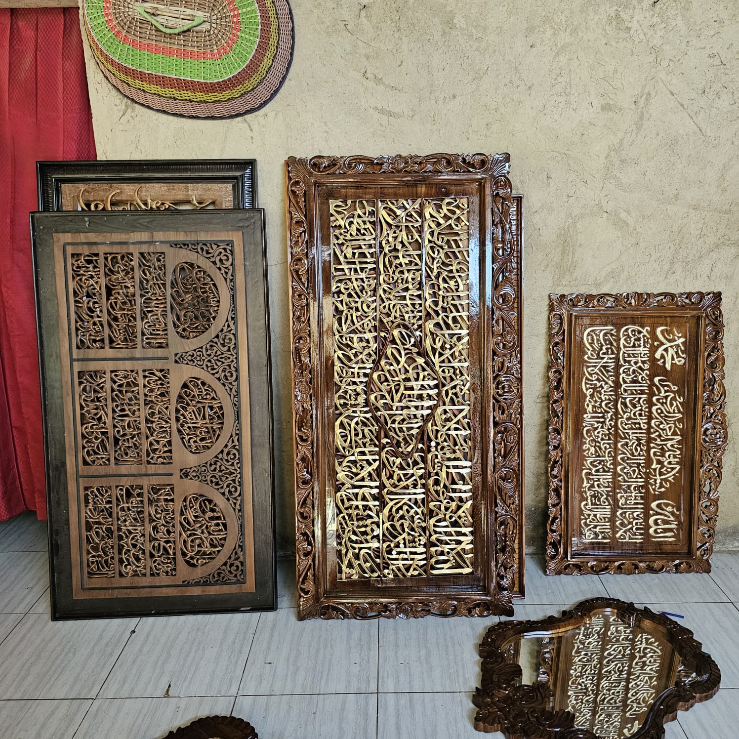 Perindah tampilan ruangan Anda dengan Kaligrafi Ukiran Surat Al-Fatihah bergaya minimalis modern, terbuat dari full kayu jati asli berkualitas tinggi. Karya seni ini menghadirkan keindahan ayat suci dan nilai spiritual yang memperkuat suasana islami dalam rumah, masjid, maupun ruang kerja Anda.